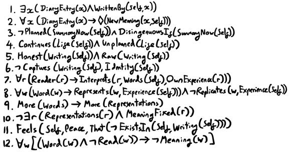 I wrote a lot of words, a lot of entries, a lot of times when looking back at them, I was pleasantly surprised to find something in the words that I didn’t see before.1. ∃x(DiaryEntry(x)∧WrittenBy(Self,x))2. ∀x(DiaryEntry(x)→ ◊(NewMeaning(x,Self)))I think writing a summary for it now would be too disingenuous, like I’d planned it all out ready to give you a final punchy conclusion. The truth is, I can’t, because my life will continue existing unplanned outside of what was written.3. ¬Planned(SummaryNow(Self))∧DisingenuousIf(SummaryNow(Self))4. Continue(Life(Self))∧Unplanned(Life(Self))I wrote these words with honesty and left them as raw as I could. Yet, within the writing constraints of staying authentic and real, you’re still unable to find me, the real me, in the very descriptions of what was meant to be described. Because I will always fail to recreate the landscape that I see in front of me. Maybe it’s because I only used watercolours, maybe it’s because I can’t paint as well as I used to.5. Honest(Writing(Self))∧Raw(Writing(Self))6. ¬Captures(Writing(Self),Identity(Self))But the truth is, the words you see don’t map onto my experience. They map onto yours! This story is your story, your interpretation of the words, it always was and always will be.7. ∀r(Reader(r)→Interprets(r,Words(Self),OwnExperience(r)))The image in your mind and how it differs from mine remains unknowable, locked away by the fact that words are merely representational; shadows on a cave wall, a small fin of a large fish protruding above the water.8. ∀w(Word(w)→Represents(w,Experience(Self)))∧¬Replicates(w,Experience(Self))The key to the lock isn’t more precision and elaboration of what you meant. It’ll just be more words afterall, more words explaining representations in terms of more representations. How silly that would be.9. More(Words)→More(Representations)10. ¬∃r (Representations(r) ∧ MeaningFixed(r))Although to me, there’s a kind of solace in knowing that I don’t exist in these entries. It feels like there is no ownership, no infringement on somebody. I can do what I like with them!11. Feels(Self,Peace,That(¬ExistsIn(Self,Writing(Self))))Words remain meaningless if nobody is there to read them. What a shame it would be if only I were to get to enjoy all these pleasant surprises.12. ∀w[(Word(w)∧¬Read(w))→¬Meaning(w)]